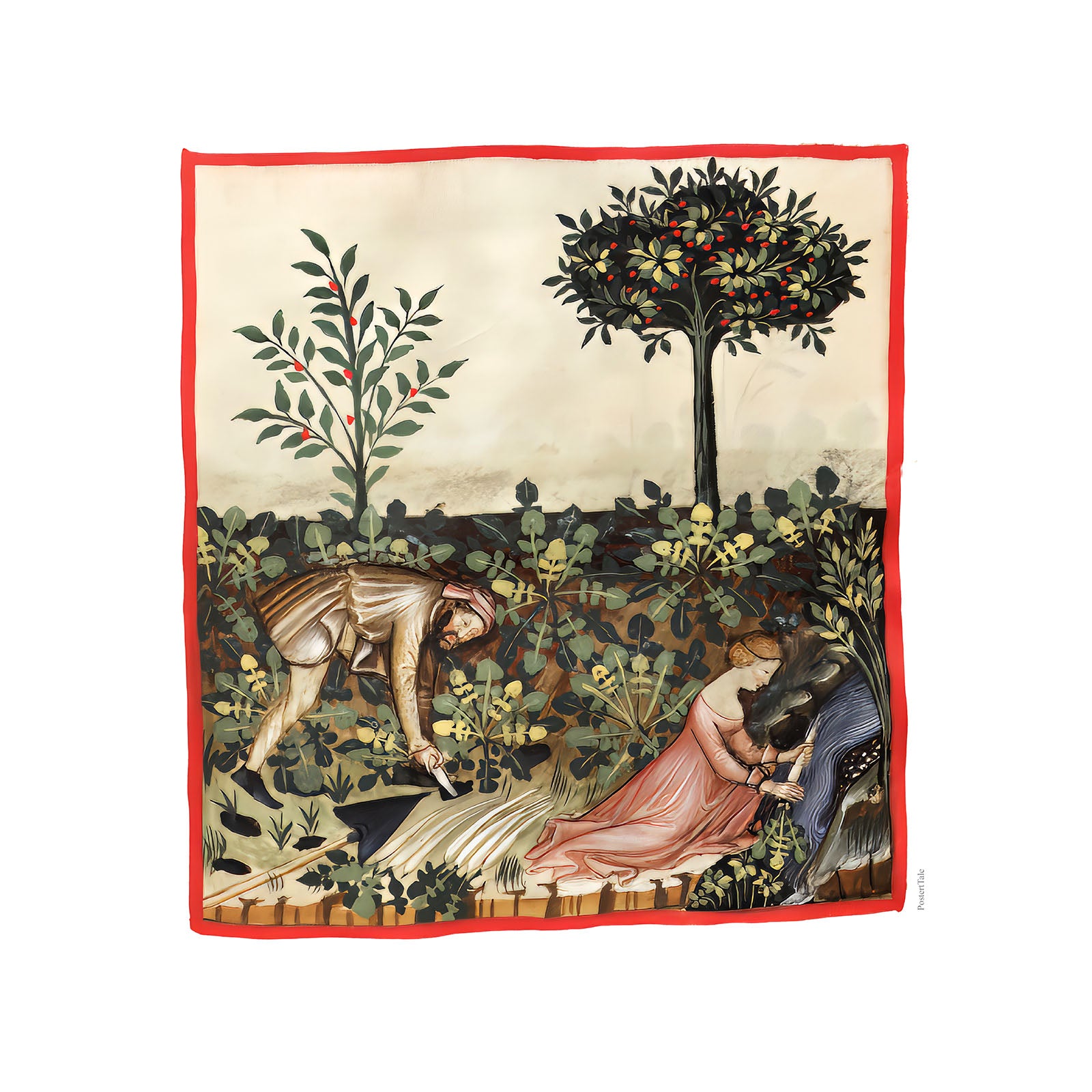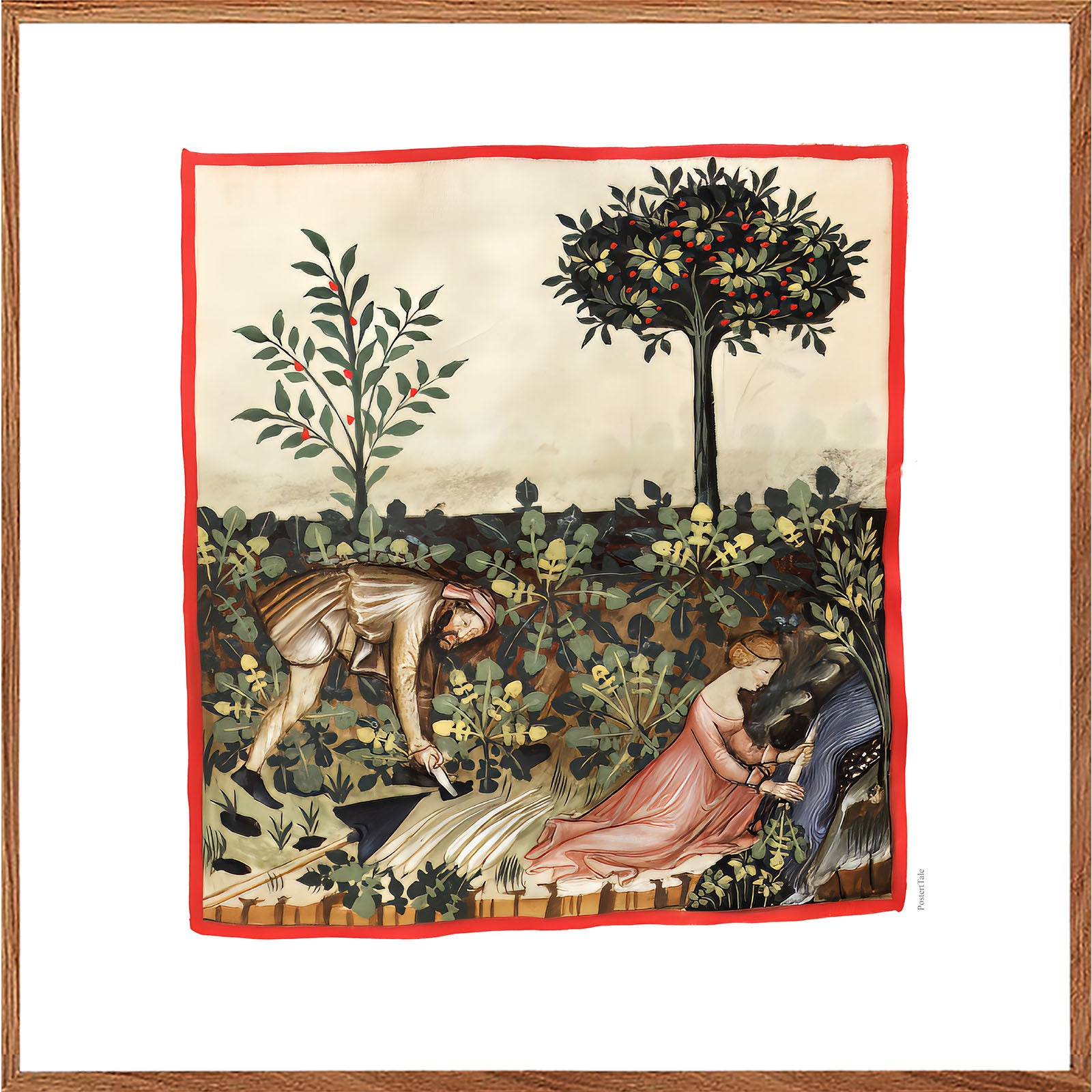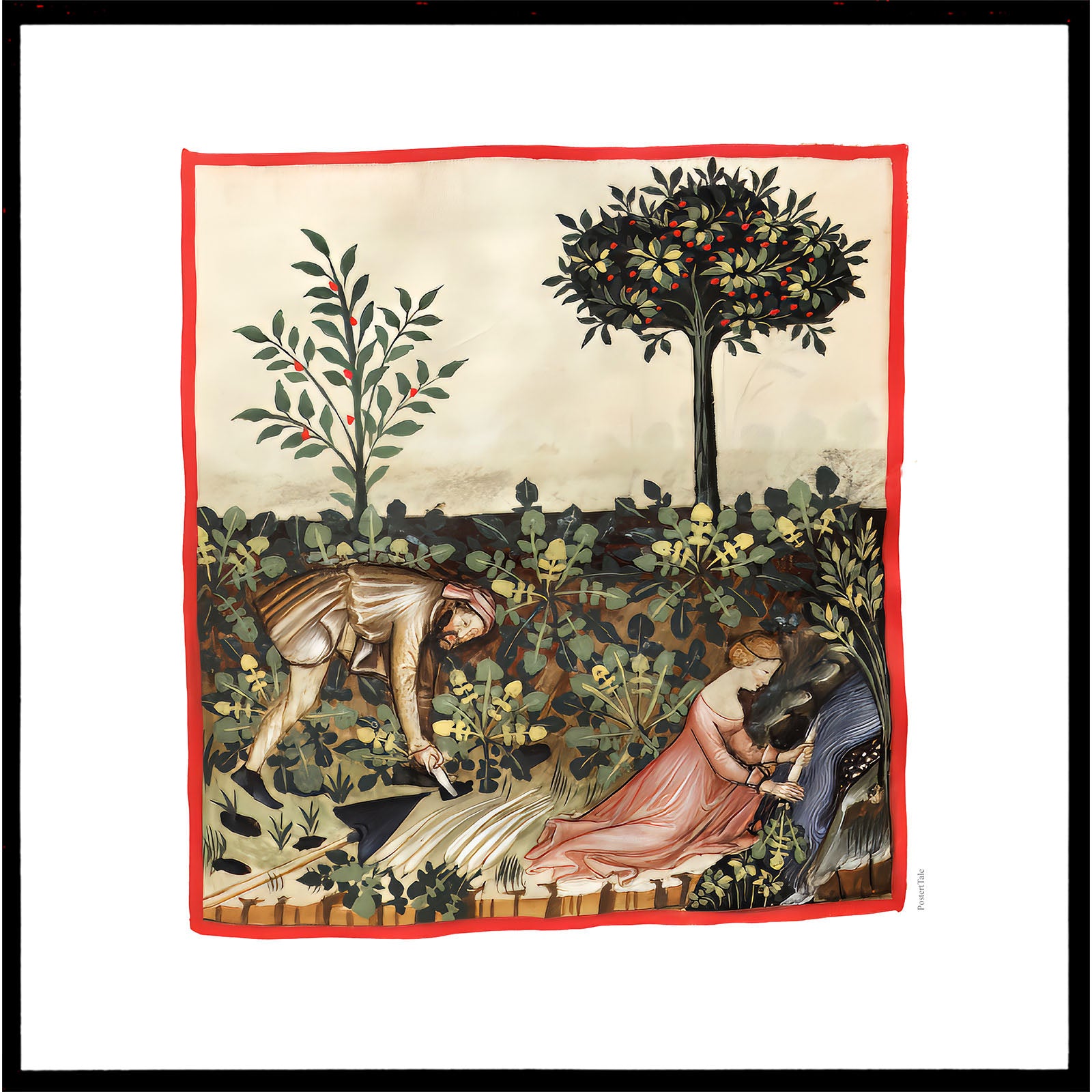 Plakat med en illustration fra middelalderen der viser en man dog en kvinde der arbejder i en køkkenhave.