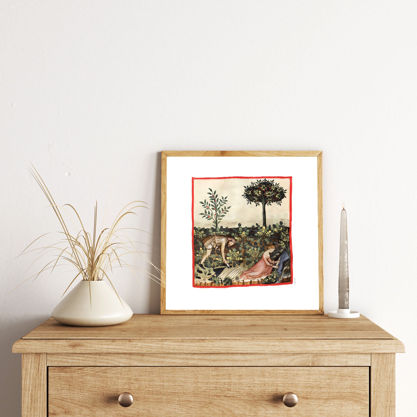 Motivet er et af de mange farvelagte illustrationer i ‘håndbogen’, Taccuinum Sanitatis, fra omkring det 14. århundrede, som var meget populær blandt den kulturelle ilite. Hver side i bogen, havde en håndtegning med et farvelagt motiv og en bekrivende tekst på latinsk. Emnet for hver side var produktion af mad og havebrug.
