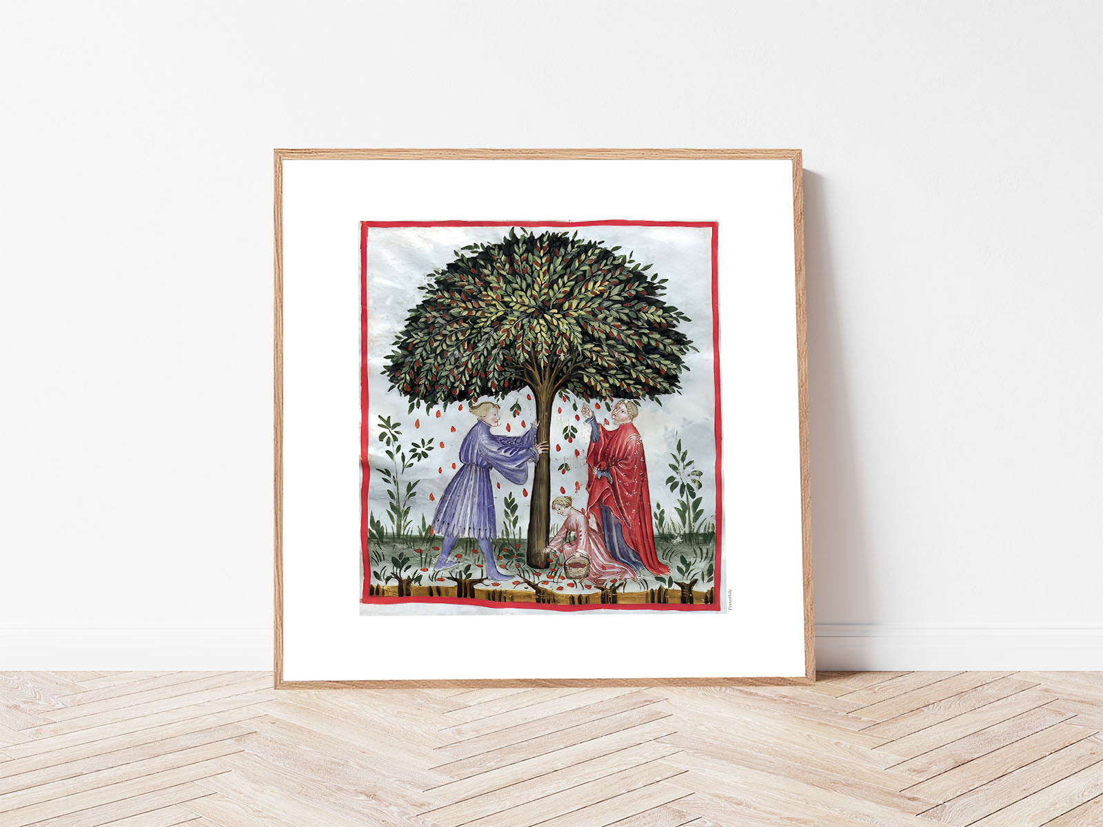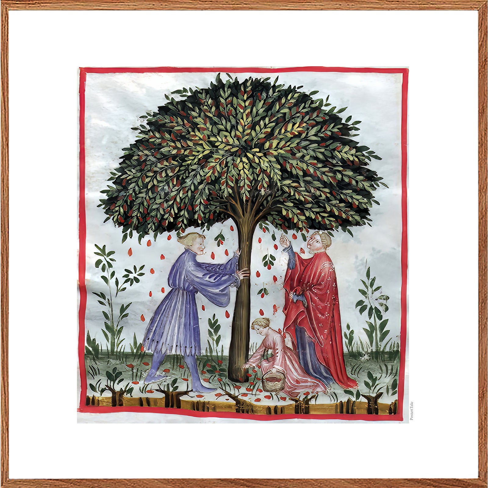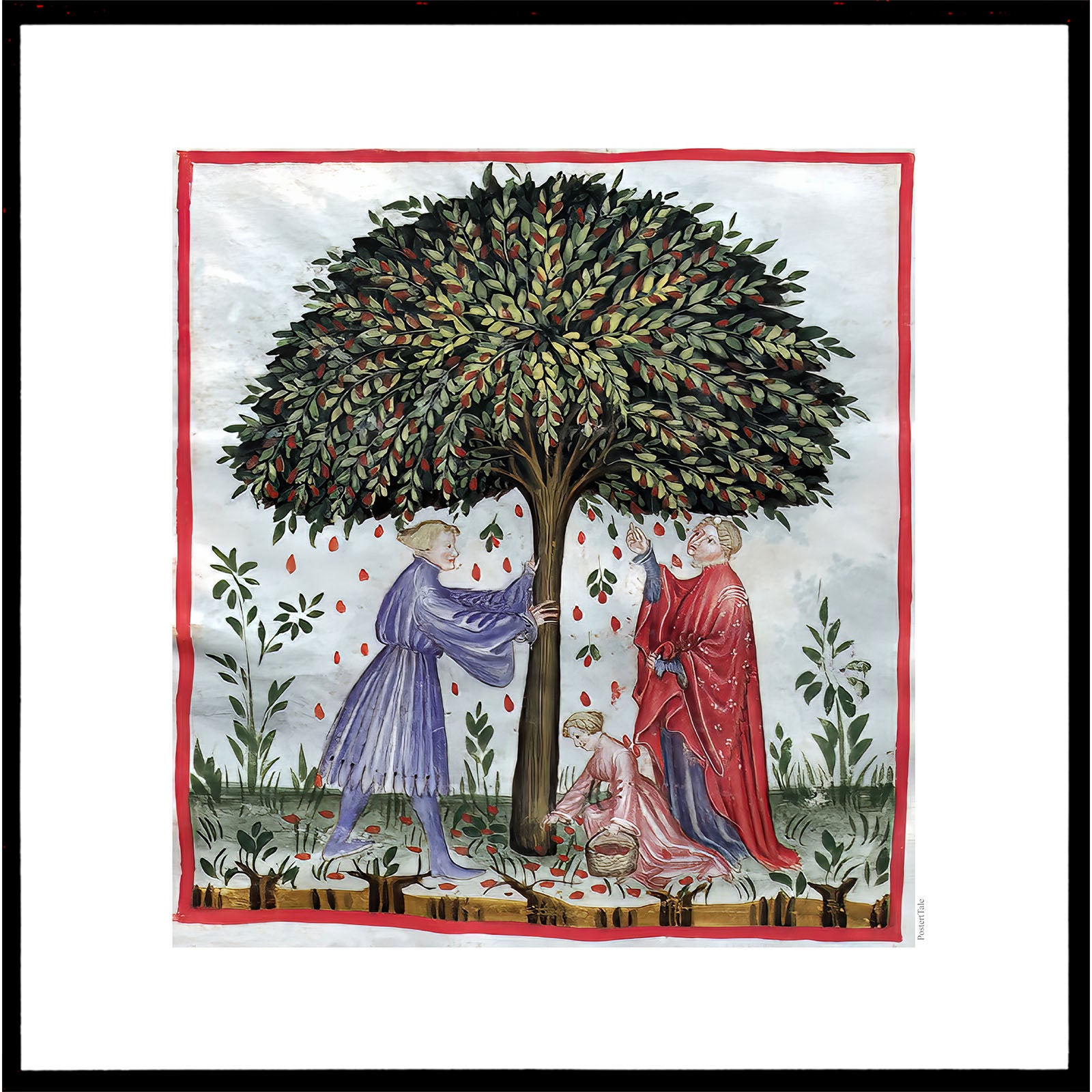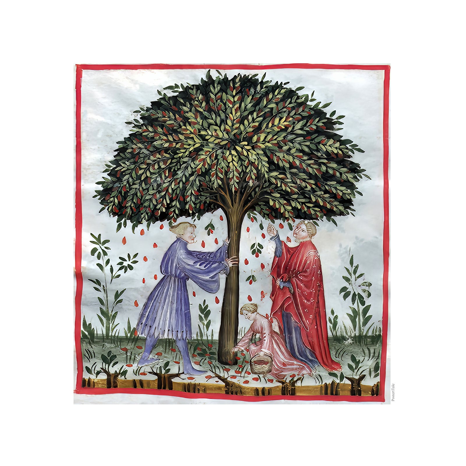 Plakat med en illustration fra middelalderen der viser indsamling af nødder (eeller en anden frugt), ved at ryste træet, så frugterne falder til Jorden, hvor et barn samler dem op.