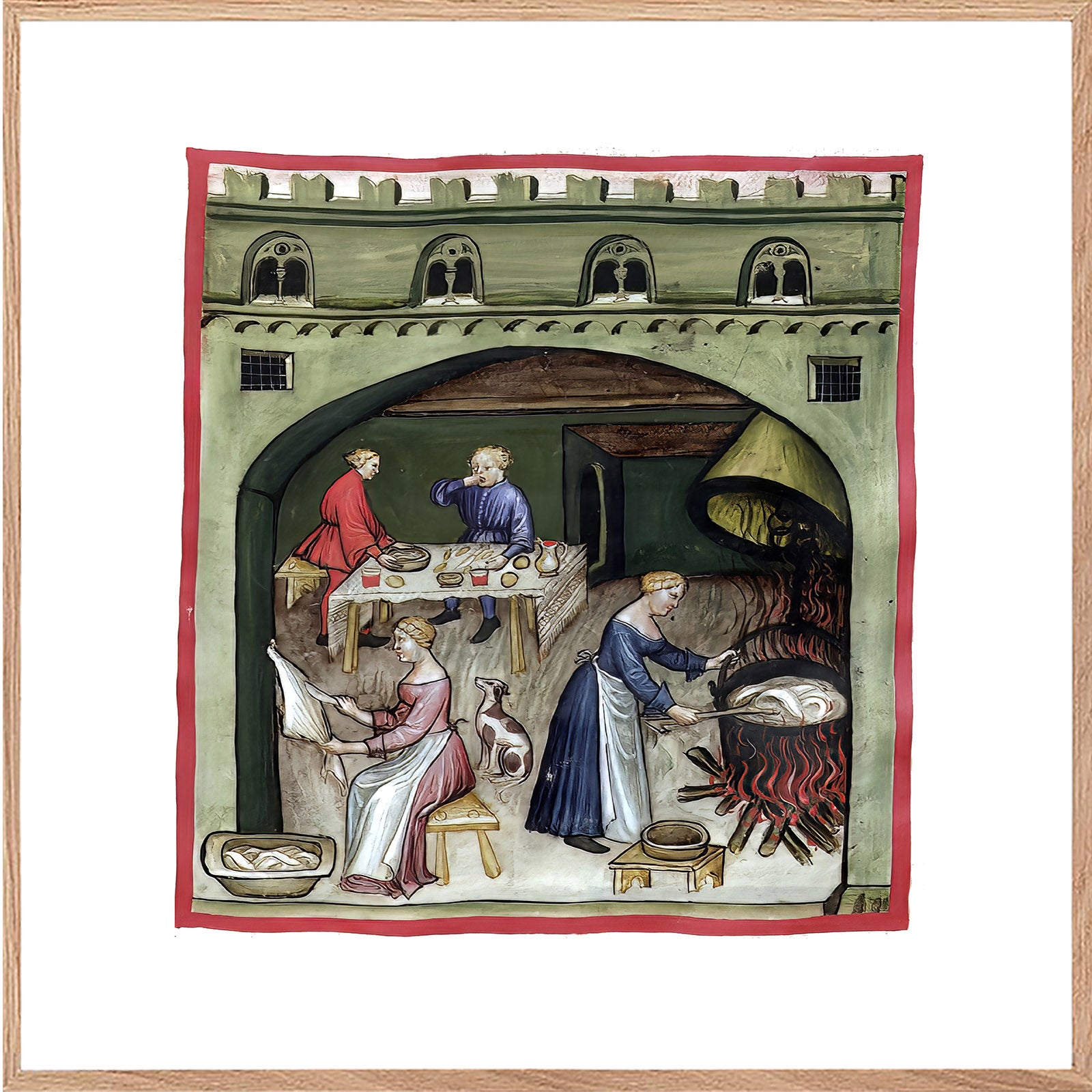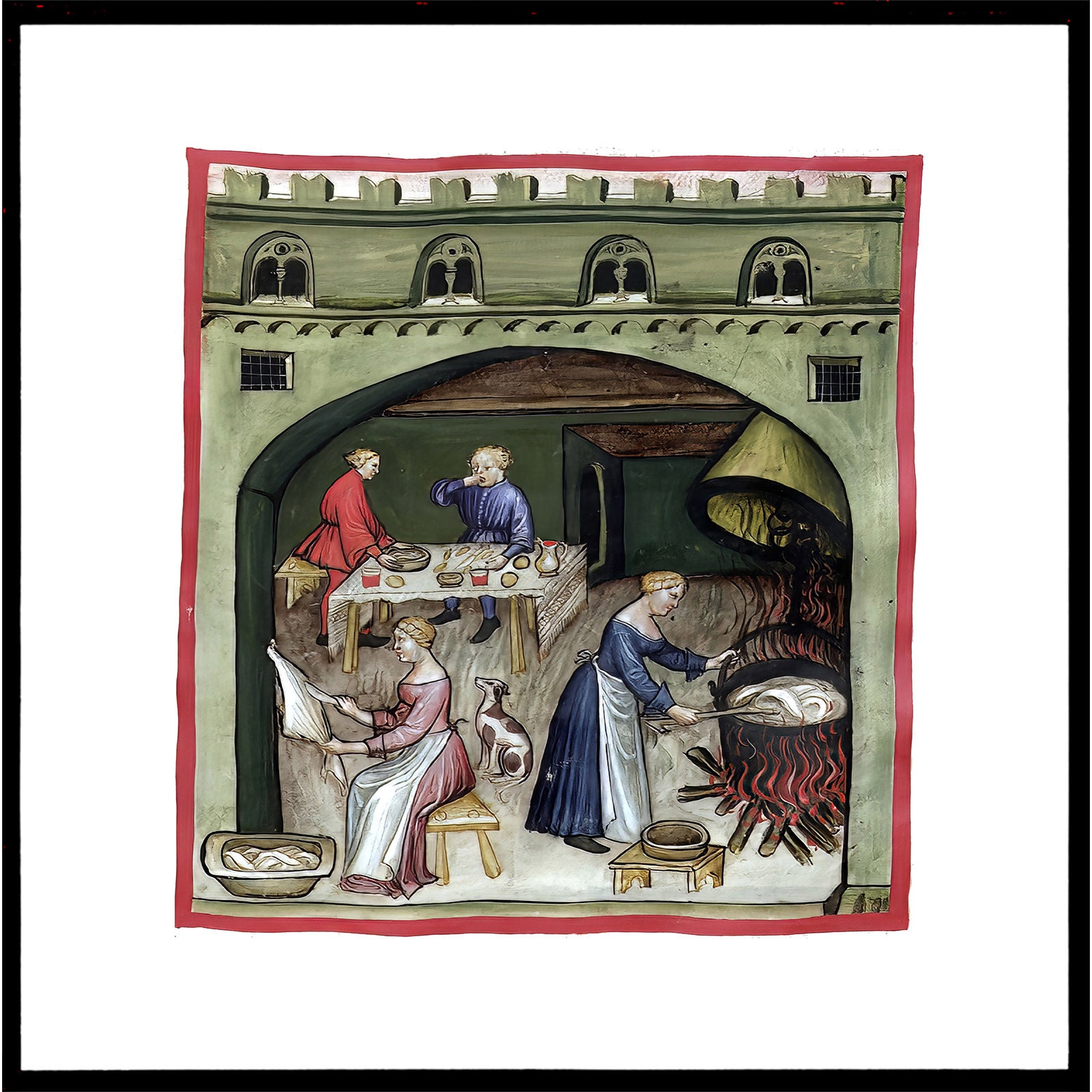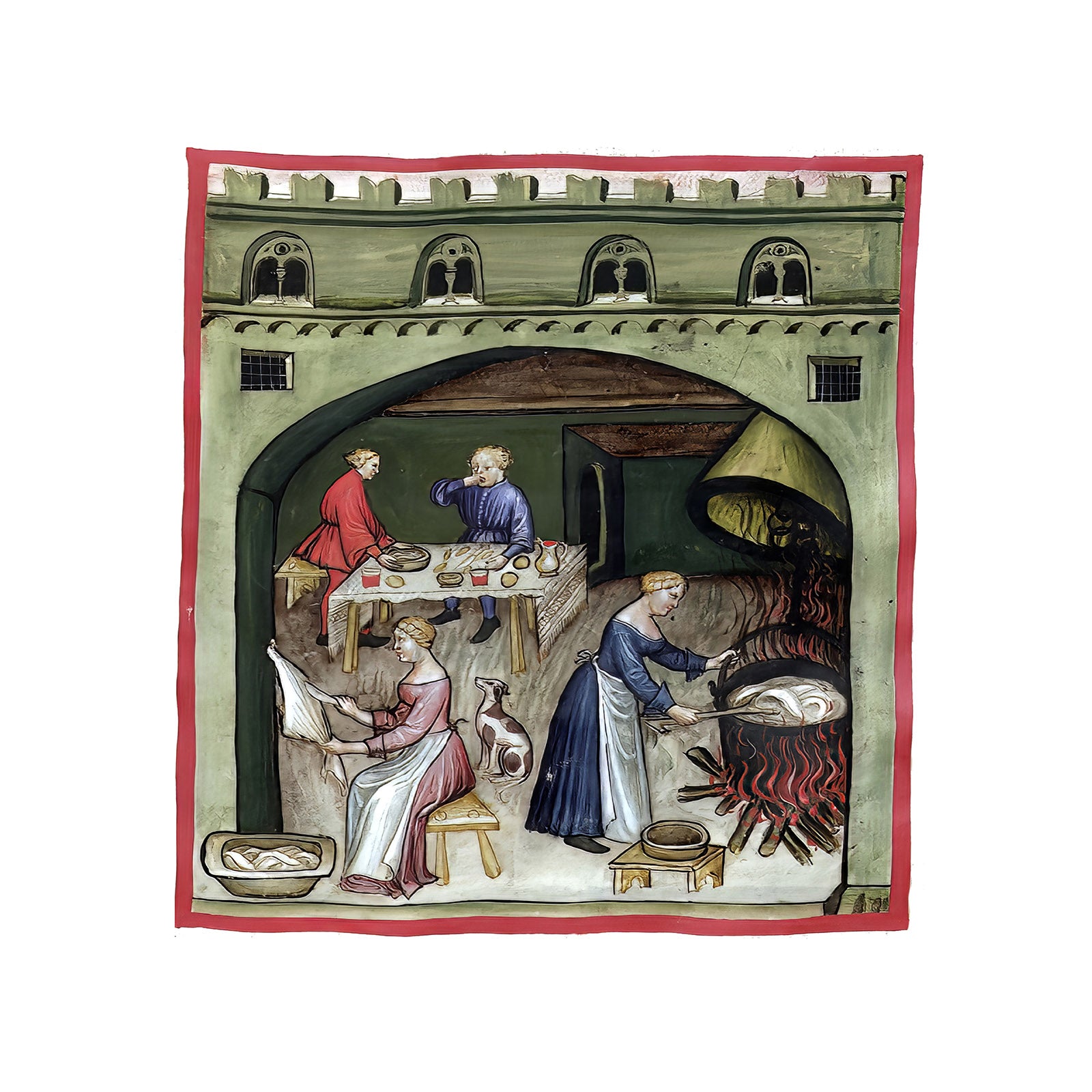 Motivet er et af de mange farvelagte illustrationer i ‘håndbogen’, Taccuinum Sanitatis, fra omkring det 14. århundrede, som var meget populær blandt den kulturelle ilite. Hver side i bogen, havde en håndtegning med et farvelagt motiv og en bekrivende tekst på latinsk. Emnet for hver side var produktion af mad og havebrug.